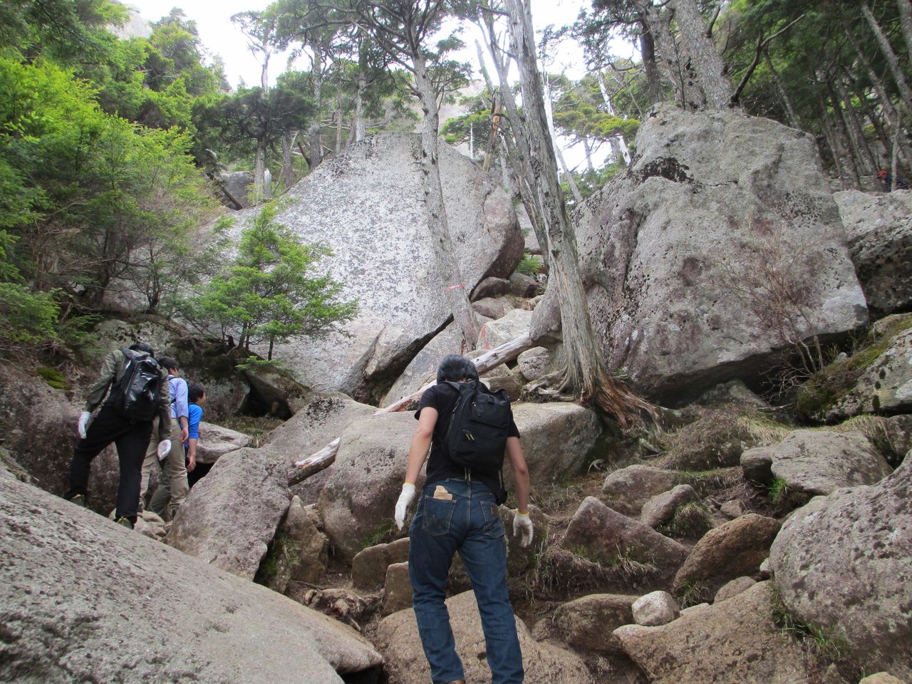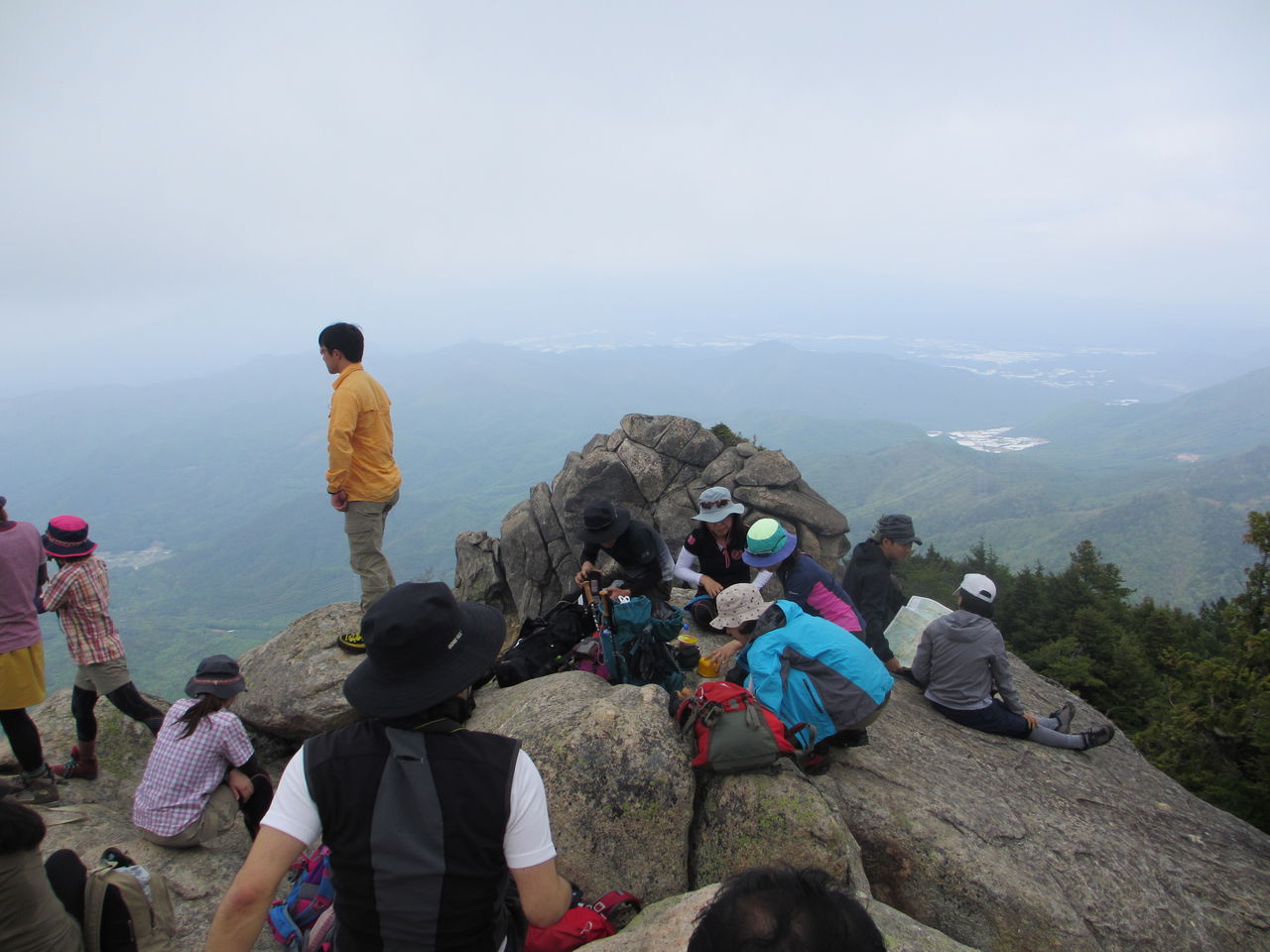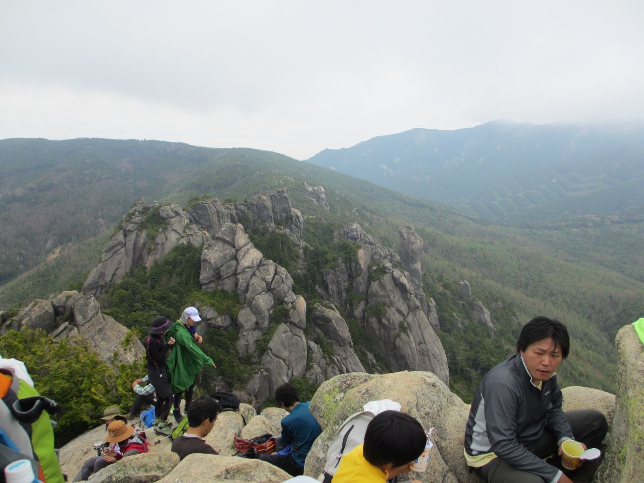 岩ばかりの急斜面を2時間ばかりよじ登り続け。。。ついに山頂に辿り着きました。なんと、そこは、さらに巨大な岩が重なり合った場所でした。既に多くの登山者が山頂に到着しており、休憩していました。