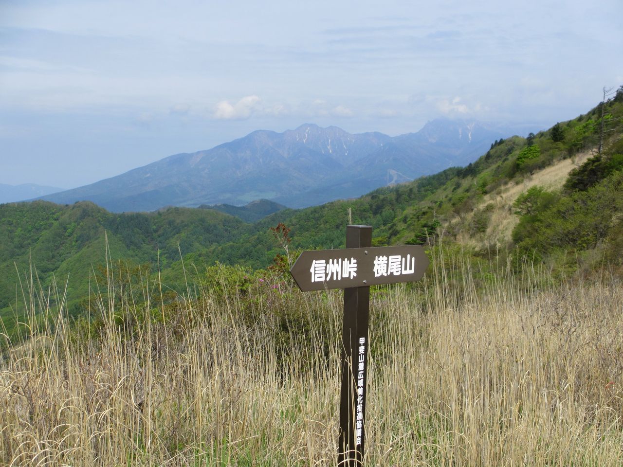 横尾山は瑞牆山とは事なり、比較的登りやすい山です。急斜面もありましたが、途中、大展望のカヤトの原からは見晴らしが良い稜線が続きました。青空とすがすがしい朝風に気分も爽快になりました。山頂までは2つくらいのピークを越えましたが、それほど大変ではありませんでした。